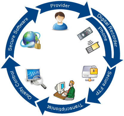 Our application is designed for optimum performance in a conventional physician's office setting. When dictations are ready to be sent, simply log on to our secure website, the place the digital recorder in the docking station and all dictations will be uploaded to the local computer and securely transferred to our central database for processing. Similarly, when patient records are transcribed, they are archived in our central database. Our clients can then log onto our server from their computer to view or download patient records.
